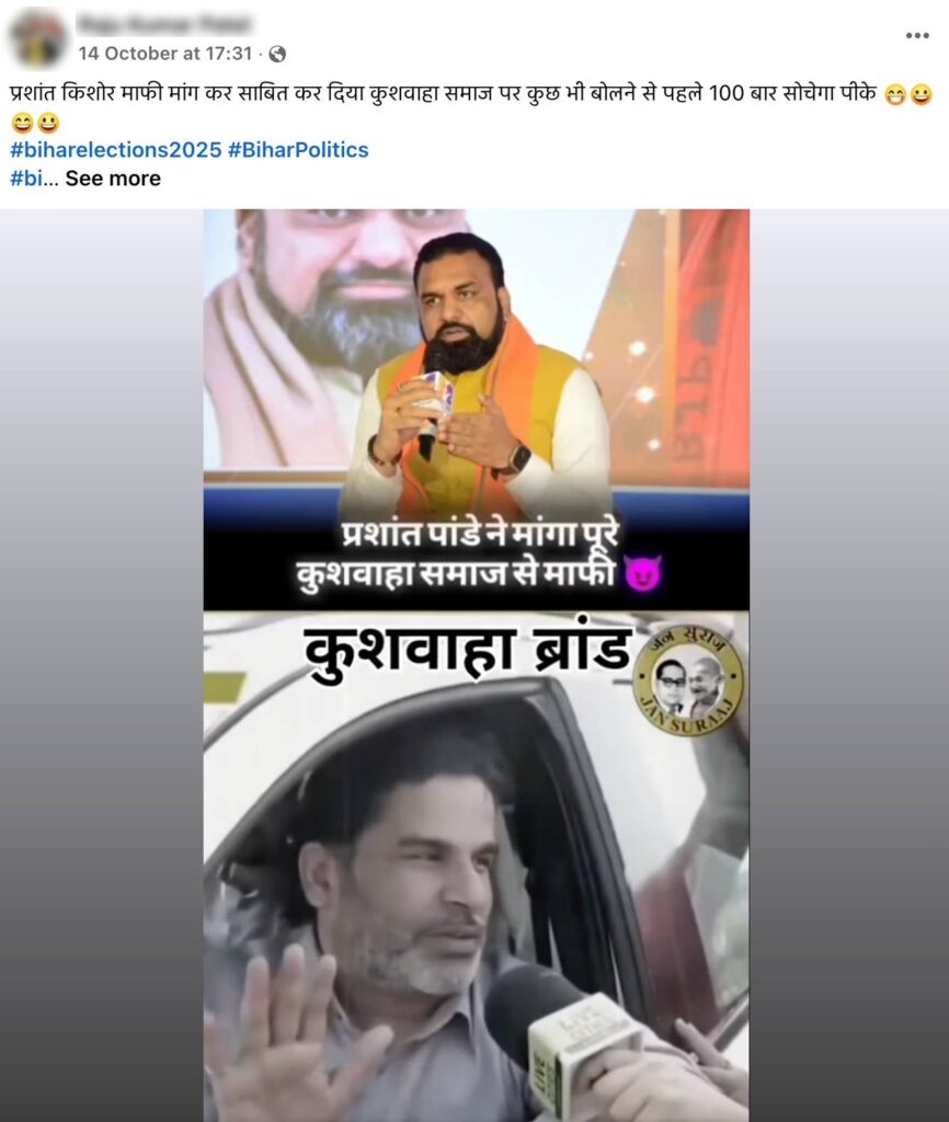 Fact: The video does not show Prashant Kishor apologising to Samrat Chaudhary or the Kushwaha community. The audio in the viral clip is edited and externally added. In the original video, he is seen criticising Bihar politics and Tejashwi Yadav’s work in his Raghopur constituency during his visit on 11 October 2025. These visuals were also shared on Jansuraj’s party’s X and Facebook accounts. Additionallly, We also did not find any reports of Prashant Kishor apologising to Samrat Chaudhary or the Kushwaha community. Hence, the claim made in the post is FALSE.