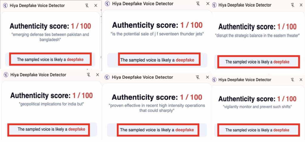 Additionally, the viral video displays clear signs of audio manipulation. The audio does not align with the lip movements, indicating it may have been digitally altered. We analysed the audio in the clip using the Hiya AI audio detection tool, which flagged the audio as a deepfake, confirming that the speech was not authentic.