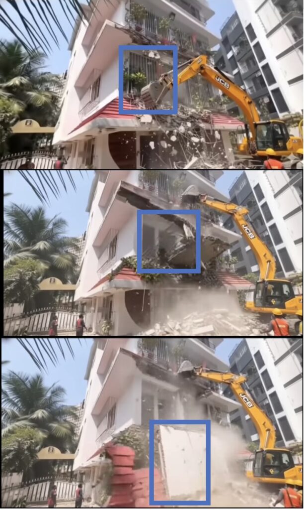 While examining the viral video, we noticed several inconsistencies that point toward digital manipulation. For instance, a slight touch from the bulldozer causes an entire wall to collapse unnaturally. The movements of both the bulldozer and the falling structure appear jerky and unrealistic. Additionally, the same side of the house looks different in separate frames of the video. Notably, the side grill being knocked down by the bulldozer suddenly turns into a wall as it falls, an error commonly seen in AI-generated visuals. These inconsistencies strongly suggest that the viral video is AI-generated.