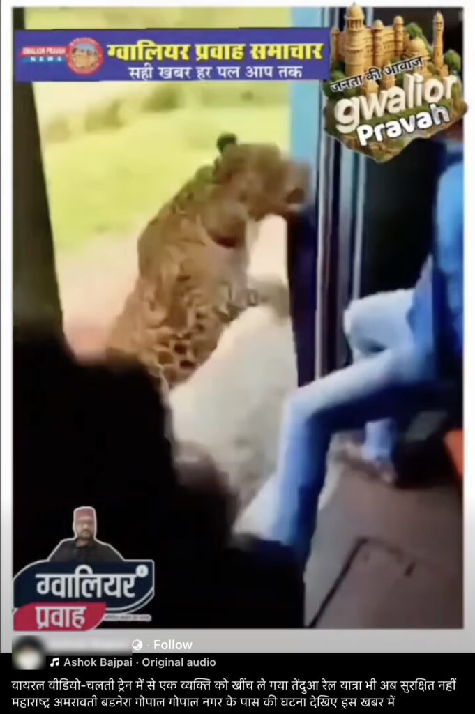 Claim: The viral video shows a leopard attacking people on a moving train and grabbing a passenger in the Gopal Nagar, Amravati district, Maharashtra.