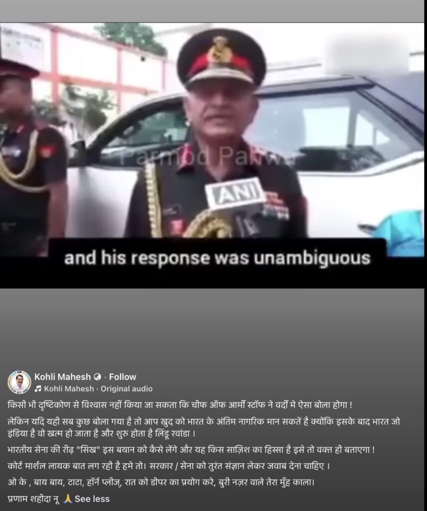 A video (here, here and here) allegedly showing General Upendra Dwivedi, Chief of the Army Staff (COAS), announcing a new policy to reduce non-Hindu soldiers by over 50% by 2028 has gone viral on social media. Let’s find out the truth behind this video.
