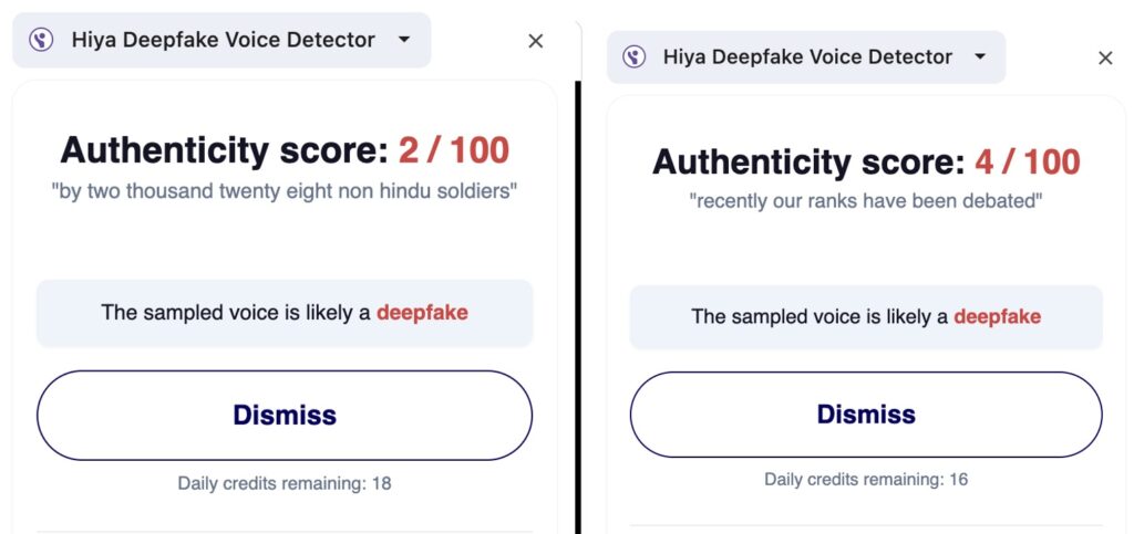 To further verify, we analysed the full audio of the viral video using an AI-based detection tool called Hiya Deepfake Detector. The tool flagged the voice as AI-generated, confirming that the audio was fabricated.