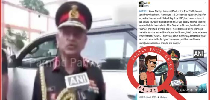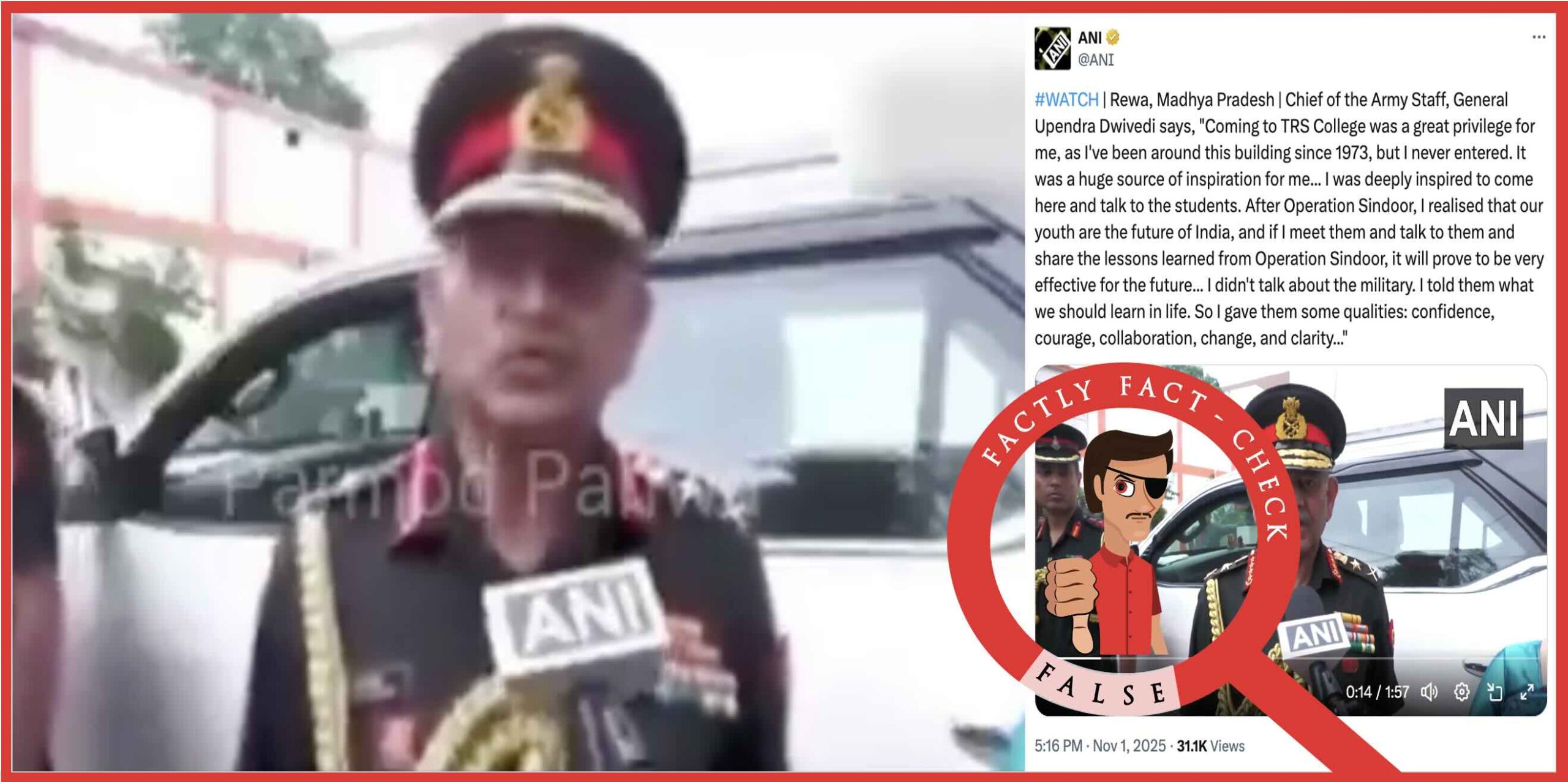 Further, a reverse image search of frames from the video led us to an ANI post dated 01 November 2025, showing the same backdrop. In the original video, General Dwivedi is seen discussing his visit to TRS College in Rewa, not any religious or military policy. The Indian Army had also shared posts about his visits to educational institutions in Satna and Rewa, confirming that his remarks were related to those events.