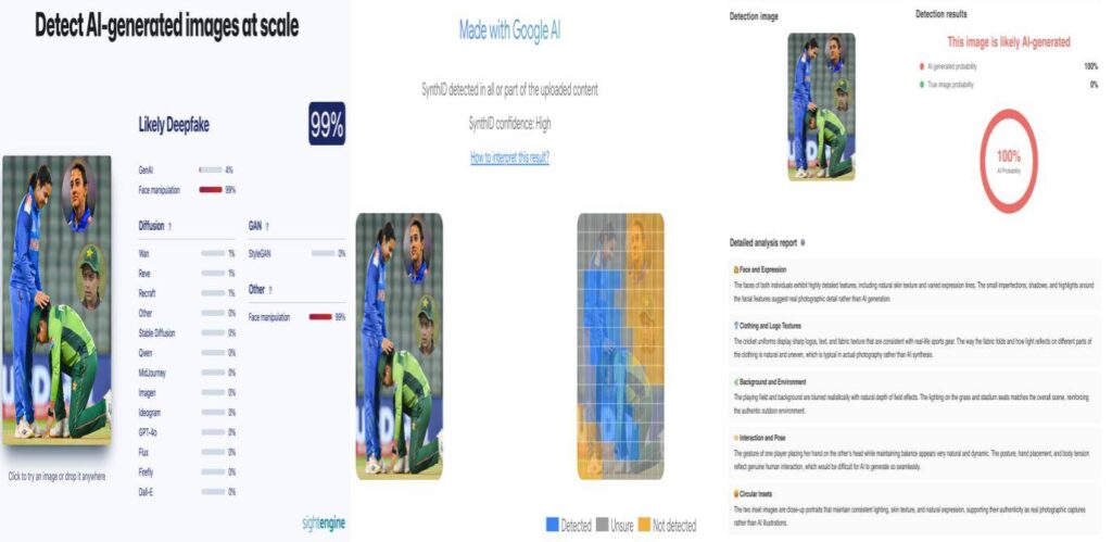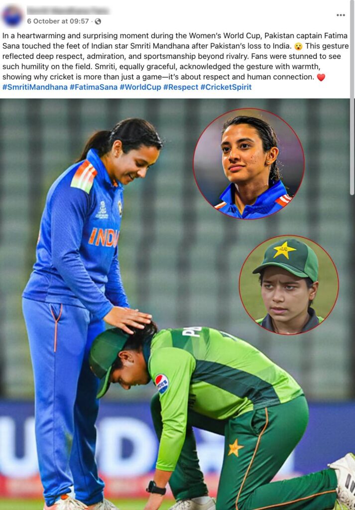 Fact: The viral image showing Pakistan cricket team captain Fatima Sana touching the feet of Indian opener Smriti Mandhana is AI-generated. No credible reports confirm such an incident, and the full match commentary on Cricbuzz makes no mention of it. Analysis using AI image detection tools such as Sightengine, DeCopy AI, and SynthID confirmed the image was AI-generated. Hence, the claim made in the post is FALSE.