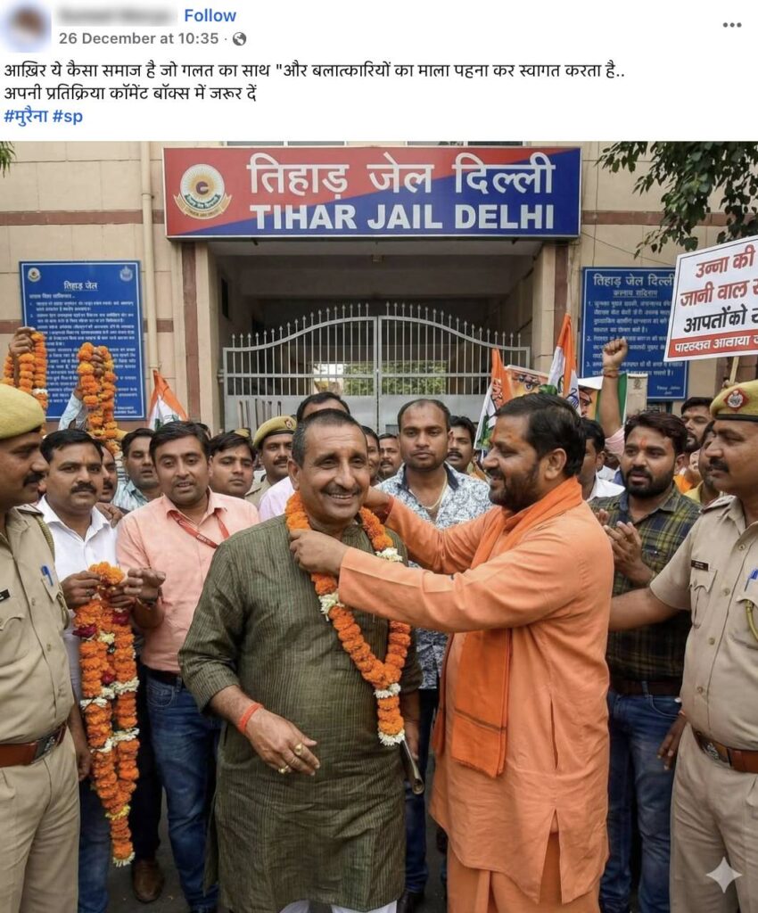 The Delhi High Court on 23 December 2025 suspended the life sentence of expelled BJP leader Kuldeep Singh Sengar in the 2017 Unnao rape case and granted him conditional bail pending appeal. In this context, a photo is being shared on social media (here, here, and here) claiming to show Unnao rape case convict Kuldeep Sengar being welcomed with a garland after his alleged release from jail following a court order. Let’s verify the claim made in the post in this article.