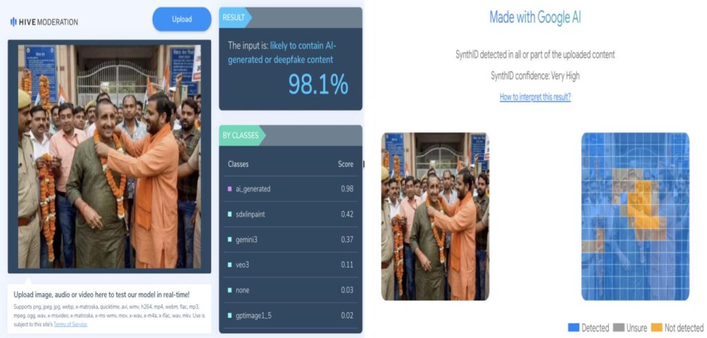 To further verify whether the viral photo is AI-generated, we analysed the photo using Synth ID and Hive AI content detection tools. SynthID indicated that the photo was generated using Google AI, while Hive AI assigned it an aggregate score of 98.1%, suggesting that the photo is likely fake.