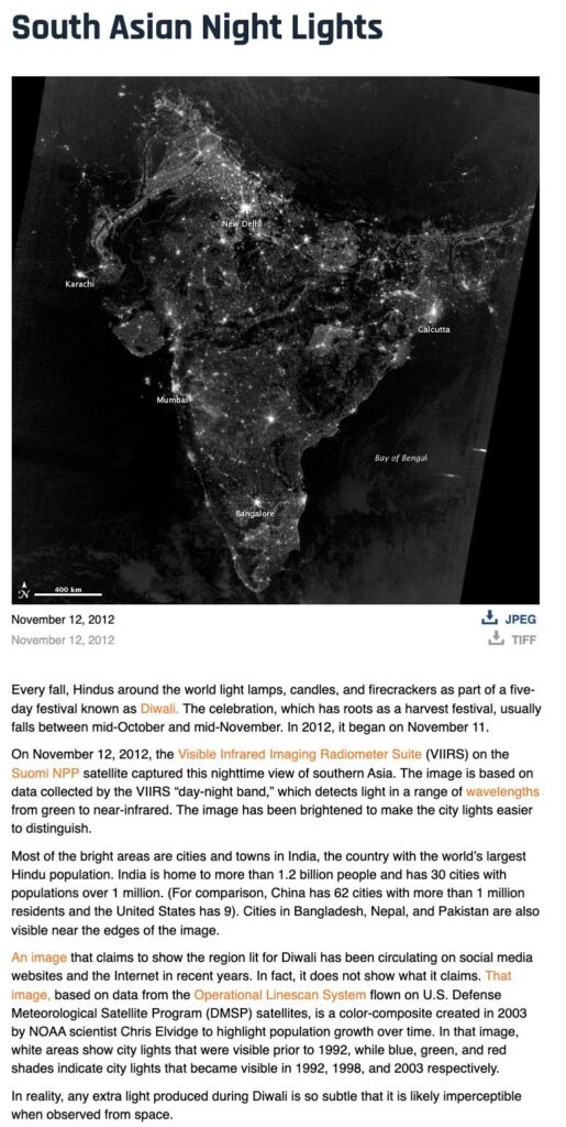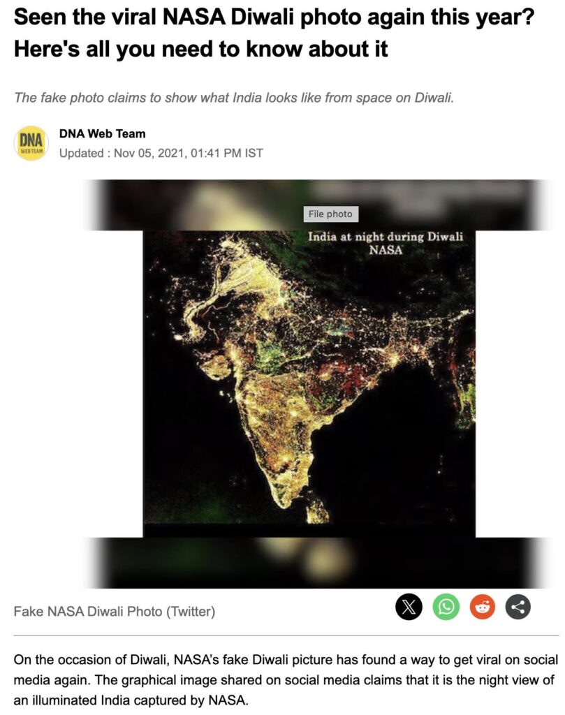 In November 2020, the Government of India’s Press Information Bureau (PIB) fact-check wing also posted on X (formerly Twitter) about this viral photo, stating that it is unrelated to Diwali or NASA and that Diwali is not incomplete without this viral NASA image. The post read: “We know Diwali is incomplete without lights, diyas, and sweets. And of course, this viral NASA image!”