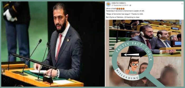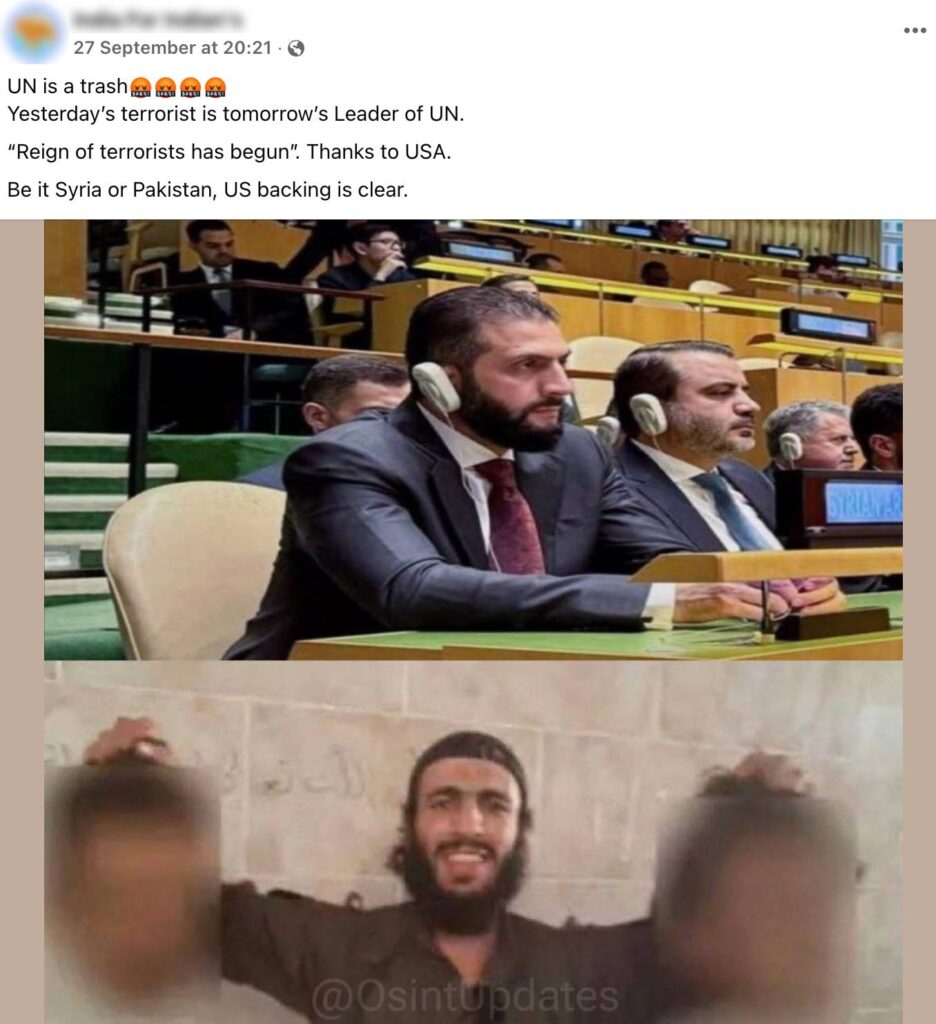 A collage of photos is being widely shared on social media (here, here, and here), claiming to show Syrian President Ahmed al-Sharaa at the UN, alongside another image allegedly showing him holding two severed heads during his time as a terrorist. The post is being shared with captions such as, “Yesterday’s terrorist is tomorrow’s UN leader. The reign of terrorists has begun,” and blames the USA, stating, “Be it Syria or Pakistan, US backing is clear.” Let’s verify the claim made in the post in this article.