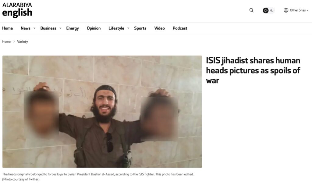 To trace the origin of the photo showing a man holding two severed heads, we conducted a reverse image search, which led us to multiple media reports (here, here, and here) from 2014 featuring the same image. According to the reports, the photo was posted online by ISIS, showing Mohamed Elomar posing with the heads of forces loyal to Syrian President Bashar al-Assad. The image was shared by Khaled Sharrouf, an Australian ISIS member. Both Sharrouf and Elomar were later killed during combat in Syria and Iraq. Sharrouf was believed to have died in June 2015 from a drone strike, but his death was only confirmed in August 2017 after a coalition airstrike near Raqqa, Syria, which reportedly also killed two of his sons. Elomar’s death was confirmed earlier in 2015, with his body recovered, while Sharrouf’s remains were not found.