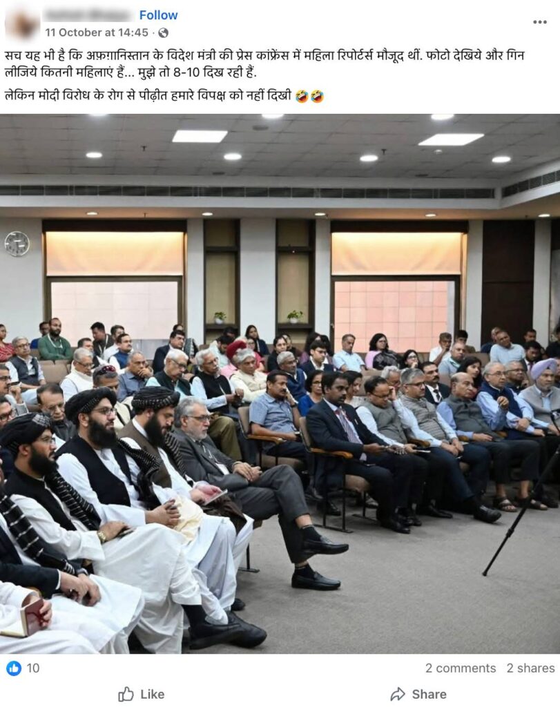 Amid the controversy over Afghanistan’s Taliban Foreign Minister Amir Khan Muttaqi’s press conference in the Afghan Embassy in New Delhi where women journalists were not allowed to attend the event, a photo circulating on social media (here, here, and here) shows a meeting or conference in a hall with several people seated, including some women, claiming that women journalists were indeed present at the press conference held on 10 October 2025, contradicting the general reporting about that event. Let’s verify the claim made in the post in this article.
