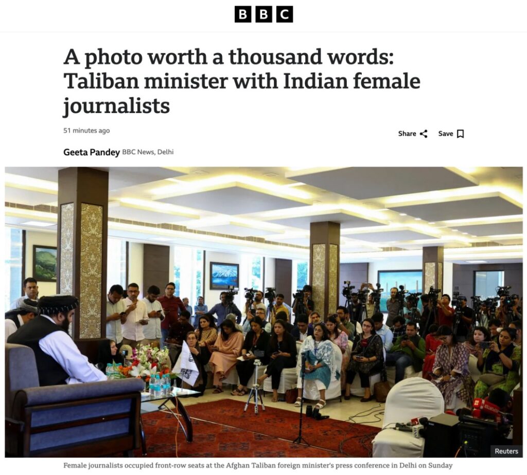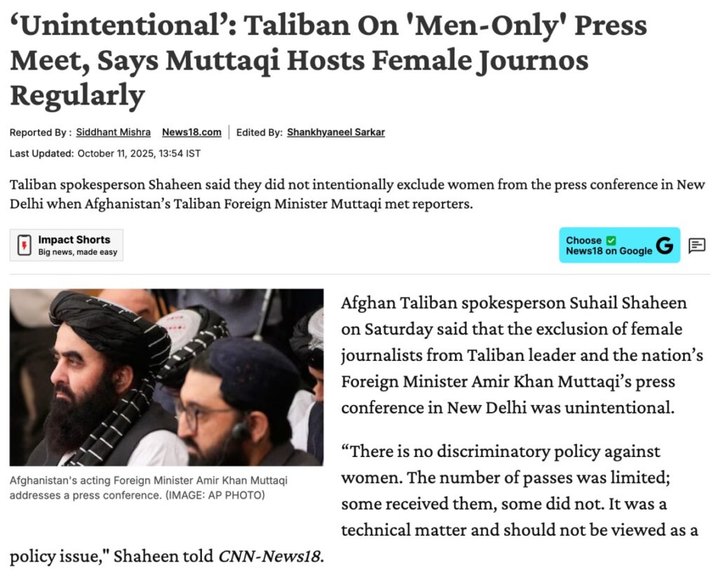On 10 October 2025, Afghan Foreign Minister Amir Khan Muttaqi held his first press conference in New Delhi inside the Afghanistan Embassy. The event faced widespread criticism as women journalists were reportedly not allowed to attend, sparking debates both in India and internationally. Media reports highlighted that the exclusion of female reporters was seen as reflecting the Taliban’s restrictive policies toward women. However, Taliban political chief Suhail Shahi reportedly stated that the entry of female journalists into the press conference was not banned and that the incident happened unintentionally. He added that the Taliban had no intention of barring female journalists from attending the event and that allegations of discrimination against them are false. Suhail Shahi also stated that there were limited passes for the press conference, which some received and others did not.