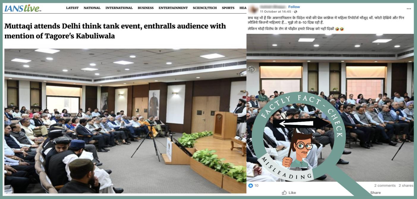 Amid the controversy over Afghanistan’s Taliban Foreign Minister Amir Khan Muttaqi’s press conference in the Afghan Embassy in New Delhi where women journalists were not allowed to attend the event, a photo circulating on social media (here, here, and here) shows a meeting or conference in a hall with several people seated, including some women, claiming that women journalists were indeed present at the press conference held on 10 October 2025, contradicting the general reporting about that event. Let’s verify the claim made in the post in this article.