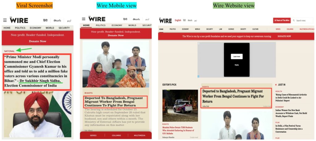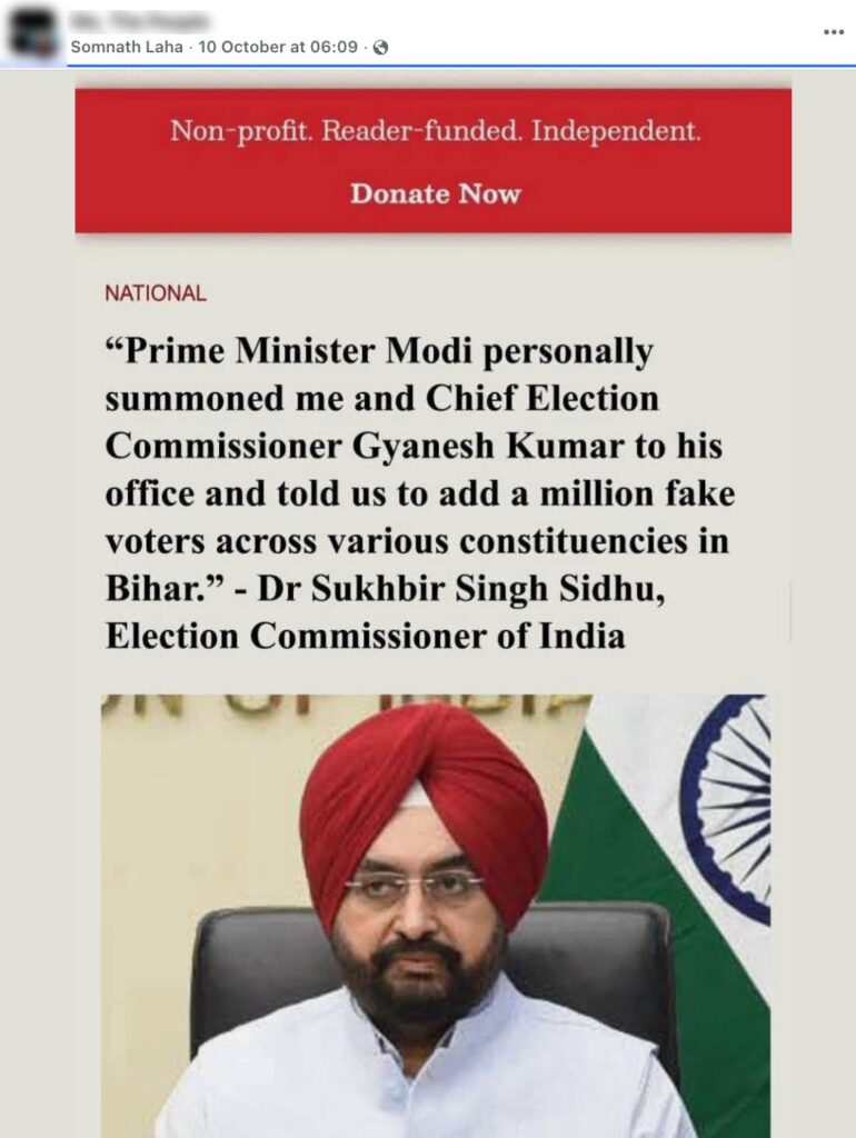 Amid this, a screenshot allegedly showing an article from the media outlet The Wire is circulating widely on social media (here, here, and here). The screenshot claims to feature a quotation from the Election Commissioner of India, named as Sukhbir Singh Sidhu, stating, “Prime Minister Narendra Modi summoned me and Chief Election Officer Gyanesh Kumar to his office and told us to add a million fake voters across various constituencies in Bihar.” Let’s verify the claim made in the post in this article.