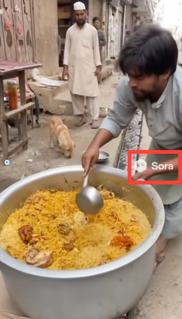To verify the truth, we closely examined the viral clip and identified multiple red flags. The video includes a “Sora AI” watermark, which is an artificial intelligence tool used to generate videos from text prompts (here and here). We also observed unrealistic details: the man lifts a heavy biryani vessel effortlessly as if it weighs nothing, and the biryani ladle moves in a stiff, unnatural manner. These are common signs of AI-generated visuals and indicate that the video is not from a real incident (here and here).