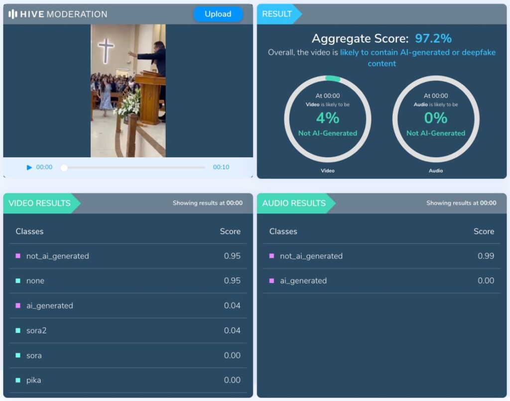 To further verify whether the viral video is AI-generated, we analysed it using the Hive AI content detection tool. The tool flagged the video with an aggregate score of 97.2%, indicating that it is likely fake.
