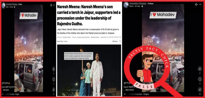 Taking a cue from these social media posts, we searched with relevant keywords on Google and found multiple media reports (here, here, and here) about the procession. As per these reports, the torchlight march was organised on 25 September 2025 in Jaipur by supporters of Rajasthan youth leader Naresh Meena, who was on a 14-day hunger strike demanding justice for the families of children who died in the Piplodi school collapse in Jhalawar, where seven children lost their lives in July 2025. The procession began at Triveni Nagar Square and concluded at Gurjar Ki Thadi, with participation from people across communities.