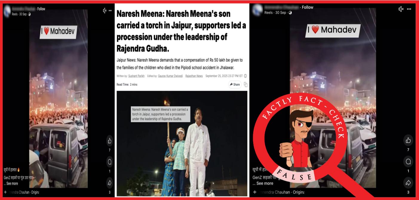 Fact: The viral video does not show a torch procession in Uttar Pradesh with people chanting “UP Police, use your batons!”; it actually shows a torchlight procession held on 25 September 2025 in Jaipur, Rajasthan, organised by supporters of Naresh Meena demanding justice for children who died in the Piplodi school collapse. Even the slogans in the video were digitally added. The UP Police also clarified on 01 October 2025 that the video is being falsely linked to them. Hence, the claim made in the post is FALSE.