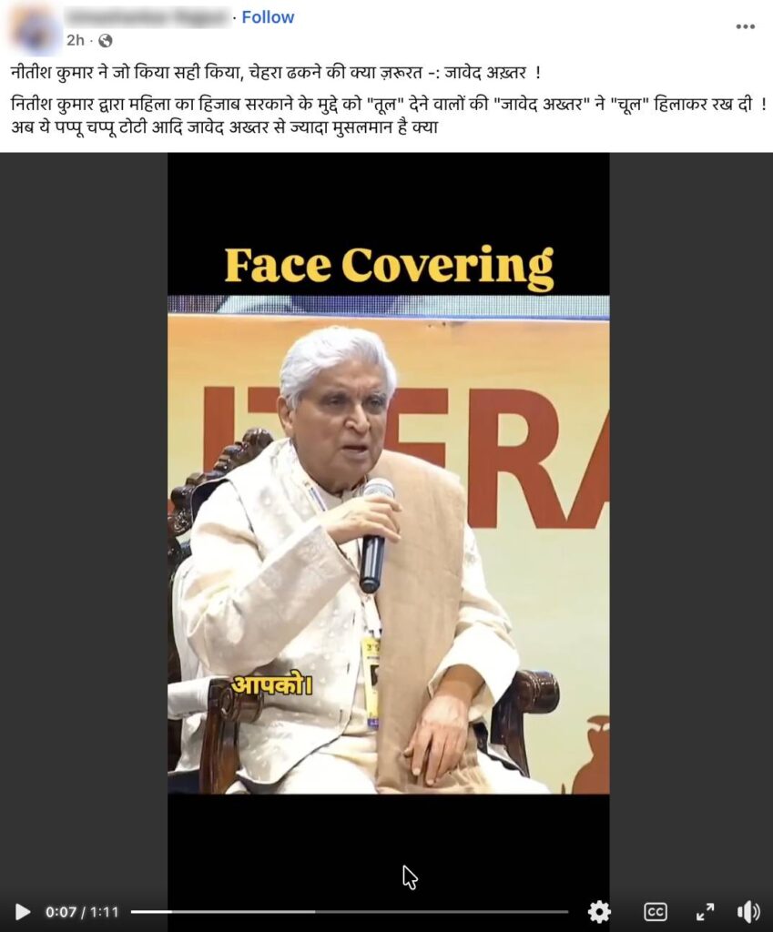 We examined the full video and found that Javed Akhtar did not mention Nitish Kumar anywhere in his speech, nor did he make any comment justifying the act of pulling down a woman’s hijab. At around the 46:00-minute mark, a burqa-clad woman asks a question about how a woman covering her face makes her any less strong. In response, Javed Akhtar offers a general critique of patriarchal norms that expect women to cover their faces. The clip is also from an event that took place before the Bihar Chief Minister Nitish Kumar amid the niqab-pulling controversy emerged.