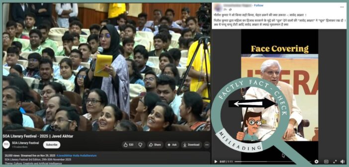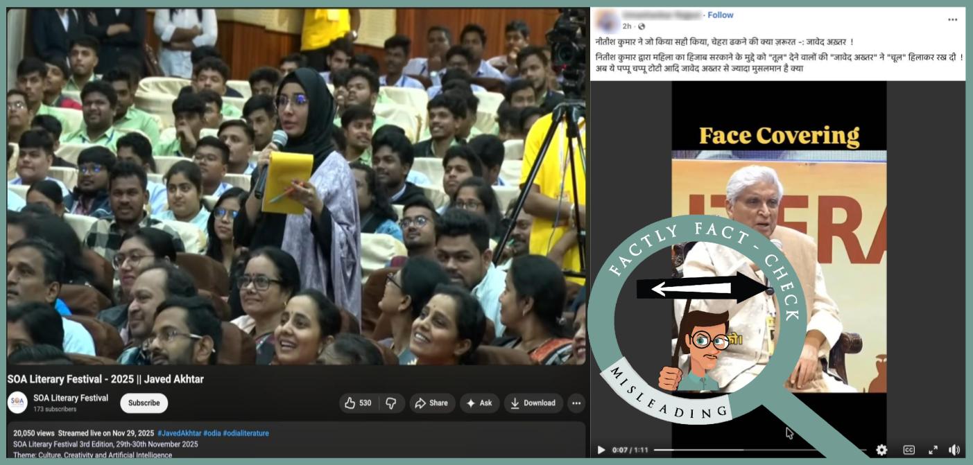 Fact: The viral video does not show Javed Akhtar backing Bihar Chief Minister Nitish Kumar. The footage is from the SOA (Siksha ‘O’ Anusandhan) Bhubaneswar Literary Festival 2025, held on 29 November 2025, and is unrelated to the Hijab-pulling controversy. Javed Akhtar’s comments in the video were not connected to Nitish Kumar and were made before the controversy occurred. On the contrary, Javed Akhtar condemned CM Nitish Kumar’s action in an X post dated 18 December 2025 and called on him to offer an unconditional apology to the woman doctor. Hence, the claim made in the post is MISLEADING.