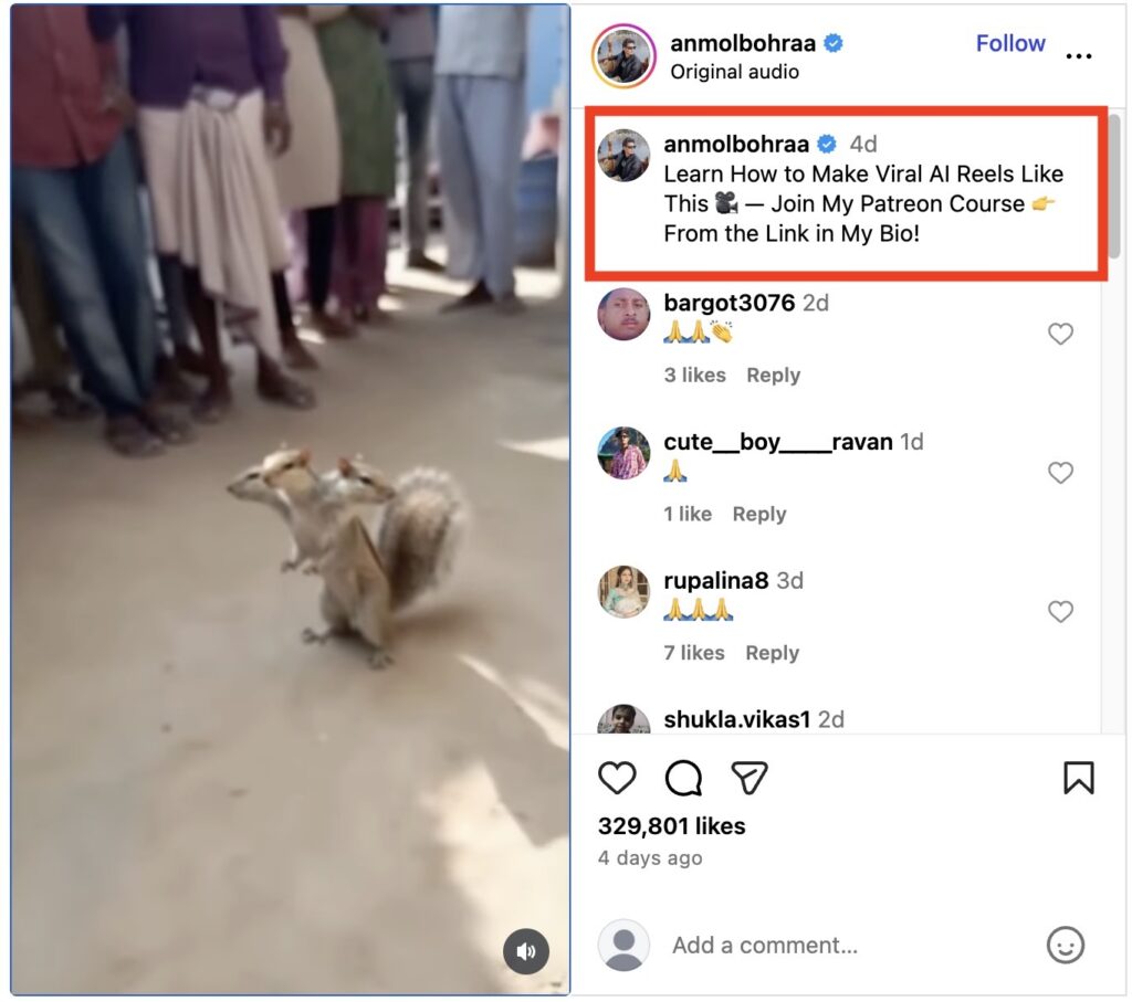 A reverse image search of keyframes from the viral video revealed that it was originally shared (archived) on a verified Instagram page named ‘anmolbohraa’ on 16 November 2025. In the video caption, Anmol Bohra stated that the video is AI-generated. The caption reads: “Learn How to Make Viral AI Reels Like This.”