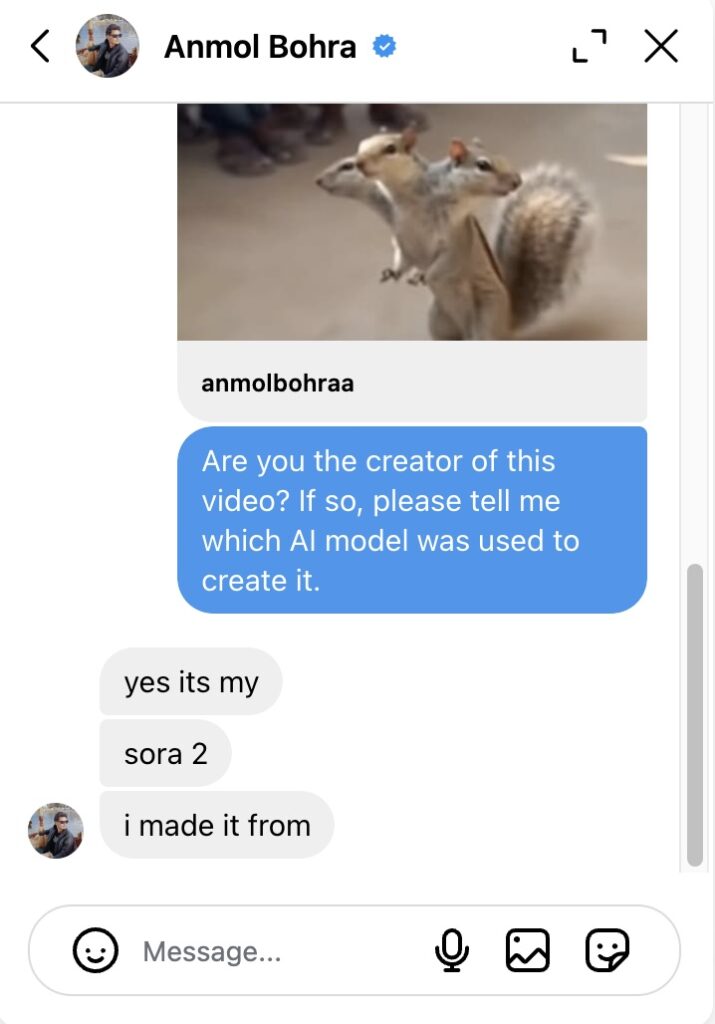 Upon reviewing the page, we found that it frequently posts AI-generated content. Furthermore, we contacted Anmol Bohra to confirm whether he is the creator of this video and to identify the AI model he used. Anmol Bohra confirmed to us that he created the video using Sora 2 AI.