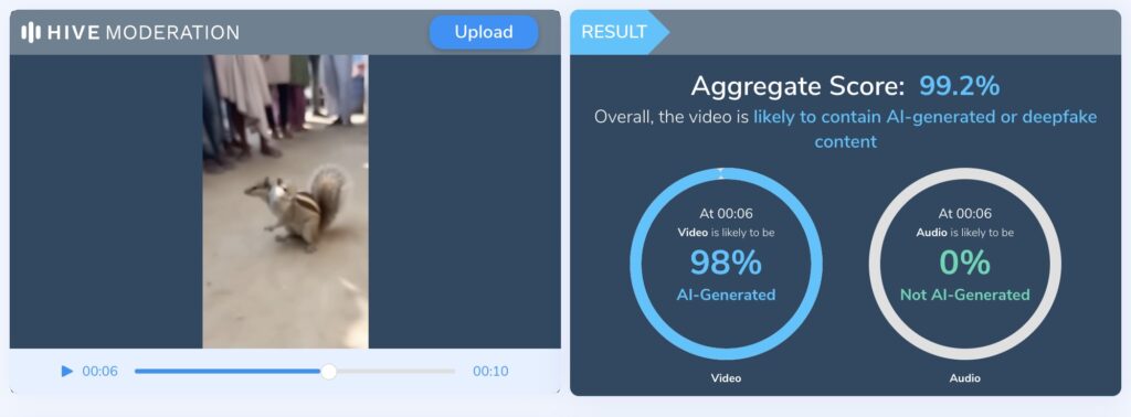To further verify whether the viral video was AI-generated, we analysed it using AI content-detection tools. Hive, an AI content-detection tool, indicated a 99.2% likelihood that the video was AI-generated. Based on this evidence, it is clear that the viral video is AI-generated.