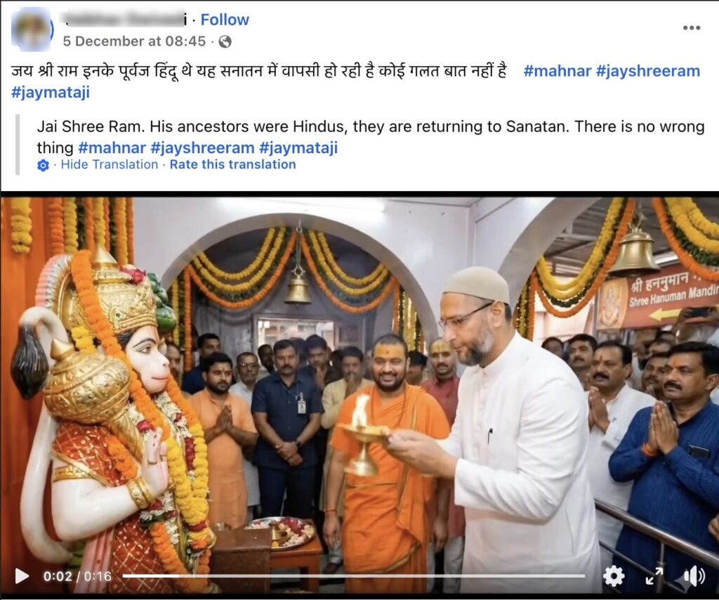 A video (here, here, here and here) of AIMIM chief Asaduddin Owaisi performing an aarti in a Hanuman temple is going viral on social media. Users are sharing it as if it is a real incident. Let’s investigate the truth behind this video.