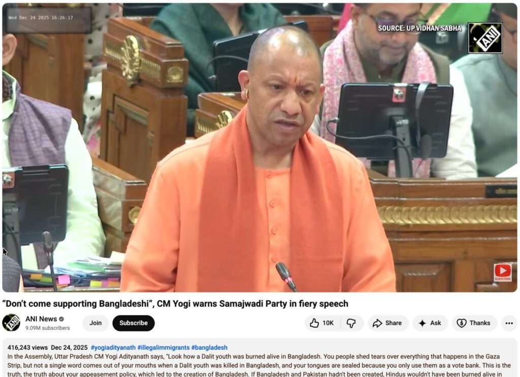 We then did a reverse image search of keyframes from the viral video, which led us to a video published by ANI News on its YouTube channel on 24 December 2025, titled “Don’t come supporting Bangladeshis, CM Yogi warns Samajwadi Party in fiery speech.” The ANI video contains only the first part of the viral clip. According to the video description, CM Yogi Adityanath, while speaking in the Uttar Pradesh Assembly, warned the Samajwadi Party and referred to the killing of a Hindu youth in Bangladesh, criticised selective outrage over international issues, and cautioned the Bangladesh government. However, the ANI video does not include any portion where he asks Prime Minister Narendra Modi to resign or calls for an attack on Bangladesh.