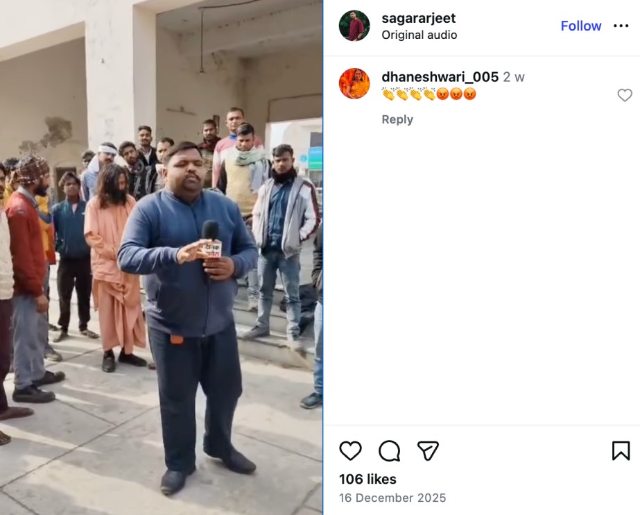 The Instagram user Arjeet Sagar had shared multiple videos related to this incident in December 2025. In a video posted on 14 December 2025, several men are seen carrying sugarcane sticks and moving towards a man dressed in saffron, apparently before assaulting him. Another video shows a reporter speaking about the incident in Punjabi while holding a microphone bearing the logo of Dainik Savera, a regional news outlet covering Punjab, Haryana, and Himachal Pradesh. In the clip, the reporter states that a man dressed in religious attire attempted to abduct a child at Tanda Railway Station.