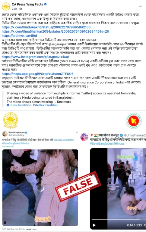 We also found a Facebook post dated 01 January 2026 by the Chief Adviser’s Press Wing of the Bangladesh government, which debunked the viral claim by clarifying that the video does not show an incident from Bangladesh and that it is actually from India.