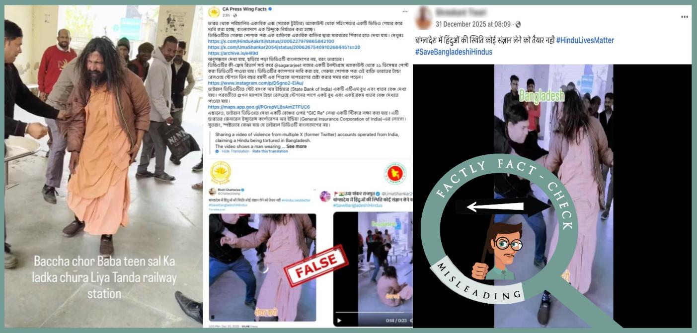 Fact: The viral video does not show a Hindu man being beaten in Bangladesh. The incident actually took place at Tanda Urmar Railway Station in Hoshiarpur district, Punjab, India, where a man dressed as a baba (sadhu) was allegedly attempting to abduct a three-year-old child and was beaten by a mob. Meanwhile, in December 2025, three separate killings of Hindu men were reported in Bangladesh. Hence, the claim made in the post is MISLEADING.