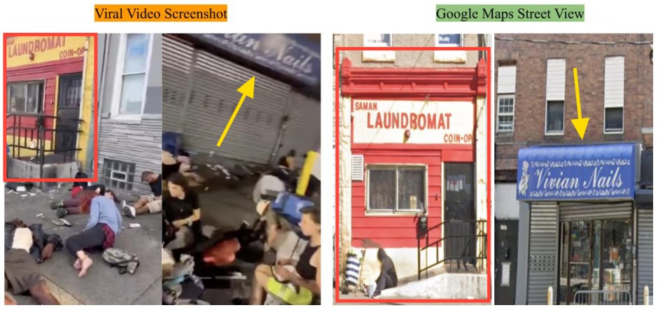 We also noticed the name boards of a few stores visible in the clearer version of the video. Using these, we geolocated the stores (here, here) and identified them as being located in Philadelphia, Pennsylvania, United States. The comparison is shown below.
