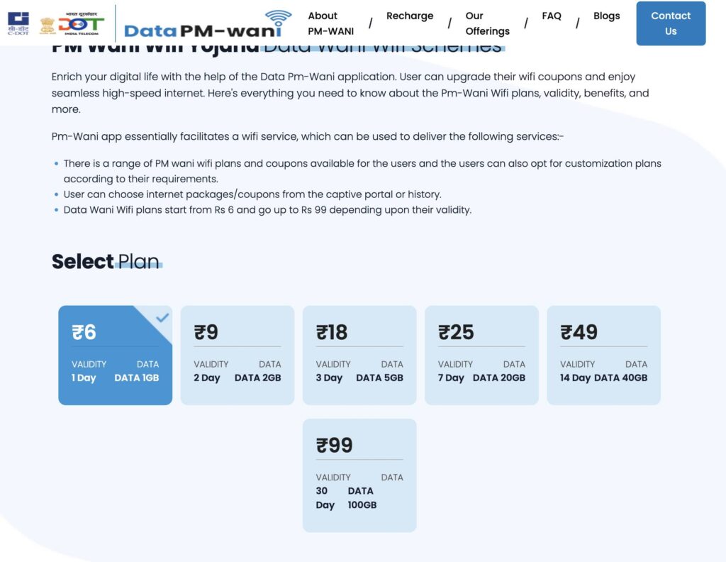 A variety of PM-WANI Wi-Fi plans and data coupons are available to users, with the option to choose customised packages based on individual requirements. Users can select their preferred internet plan or coupon through the captive portal or from their usage history. Under the PM-WANI system, Wi-Fi plans generally start from ₹6 and go up to ₹99, depending on the data limit and validity period. For more details about the PM-WANI scheme, see here, here, here, and here.