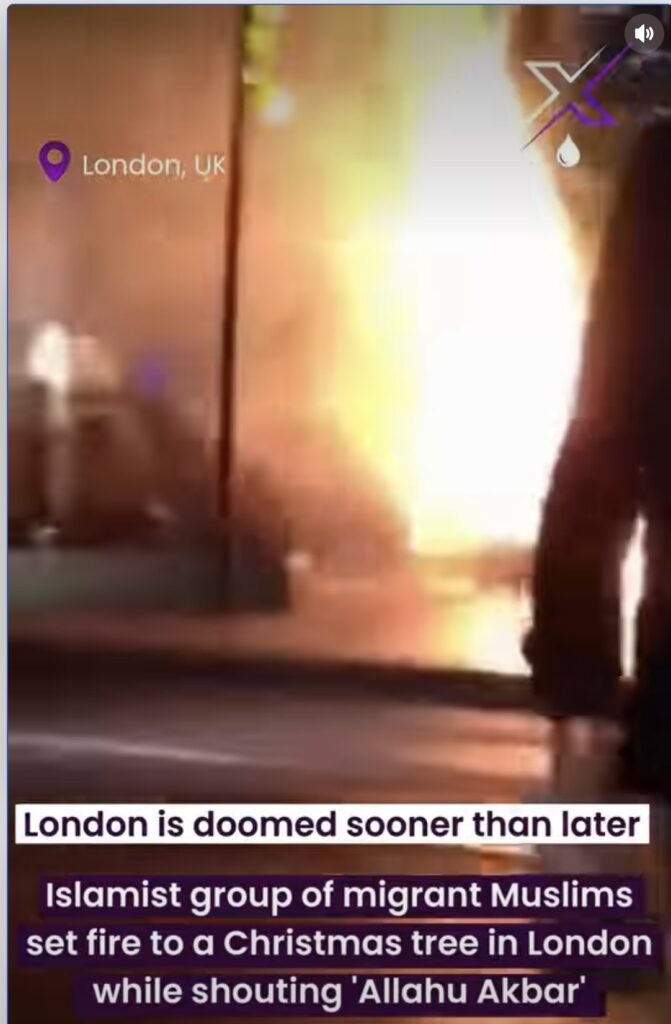 Claim: The viral video shows radical Muslims in the UK setting fire to a giant Christmas tree while chanting “Allahu Akbar” in the year 2025.