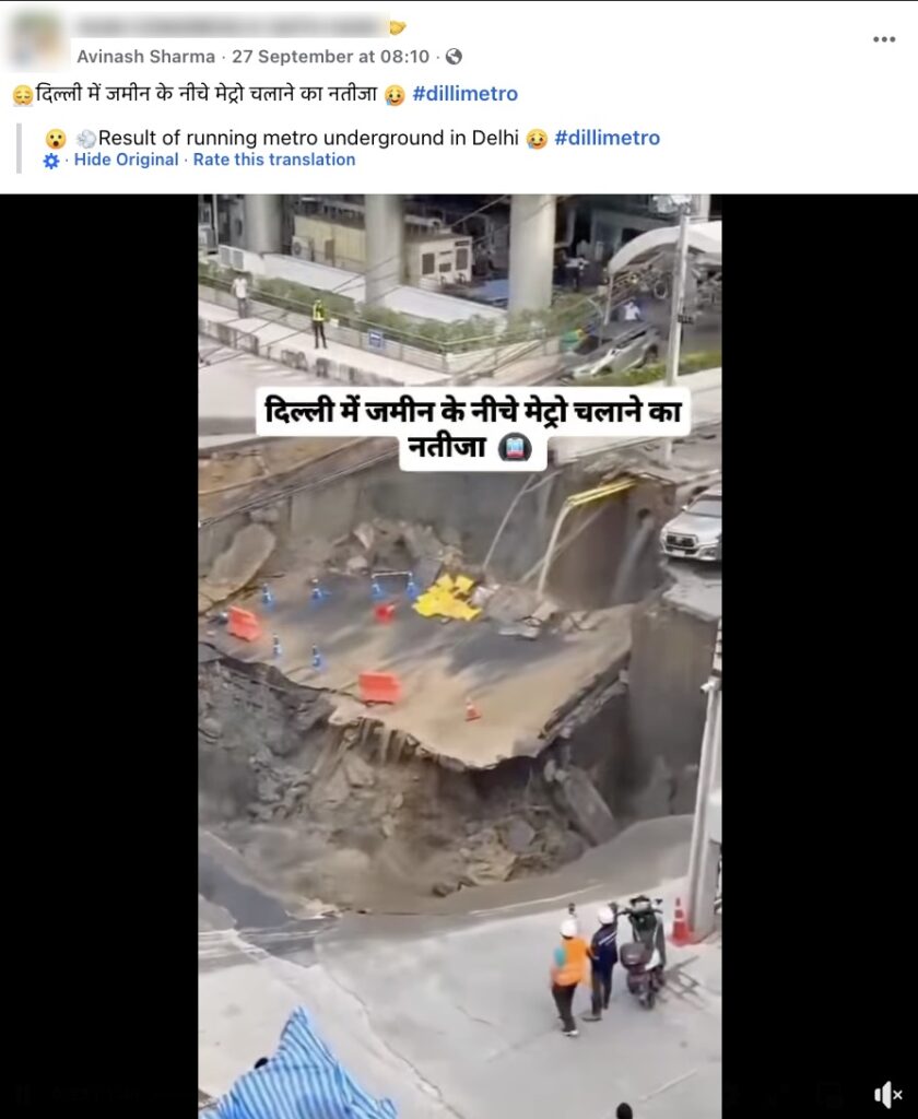 Claim: The viral video shows a road collapse and large sinkhole in Delhi, allegedly caused by metro construction.