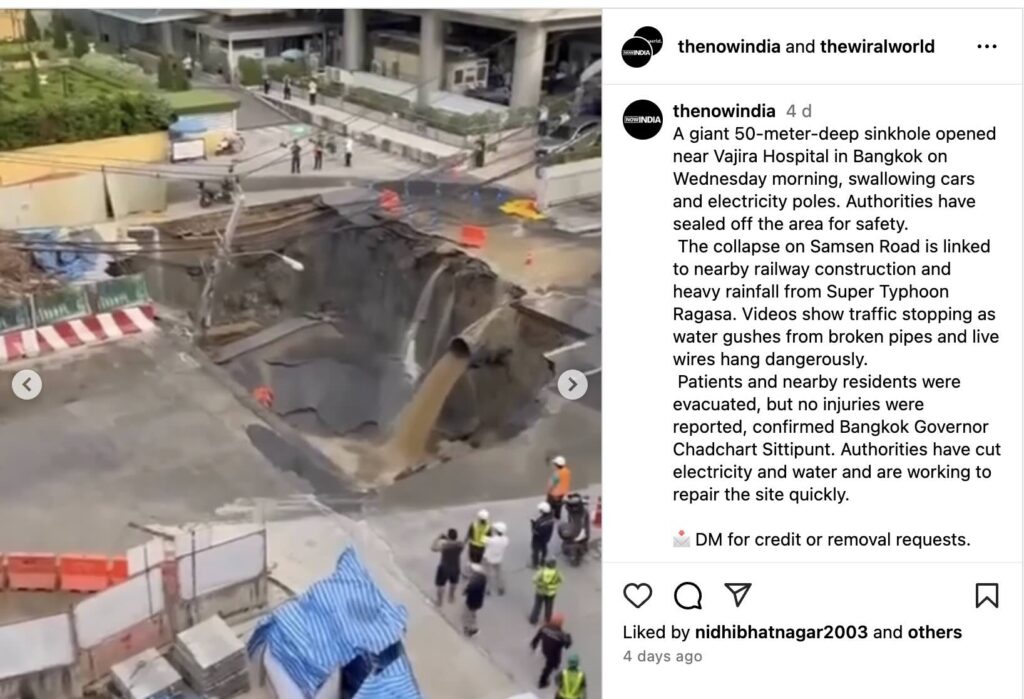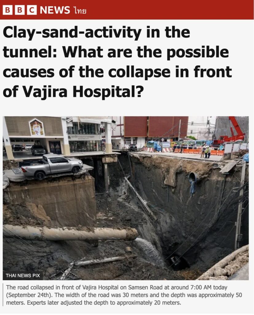 Further research led us to a BBC report on the incident. According to the BBC, on 24 September 2025, a massive sinkhole opened on Samsen Road in front of Vajira Hospital in Bangkok, linked to the Purple Line subway construction site. The collapse extended into the hospital compound, with multiple soil slides reported throughout the day, including under the Samsen Police Station. Experts indicated that soil leakage into the tunnel-station junction, particularly through sand layers, was the likely cause. Over 50,000 sandbags have been deployed to prevent further soil inflow, while investigations continue to determine the exact cause of the collapse.
