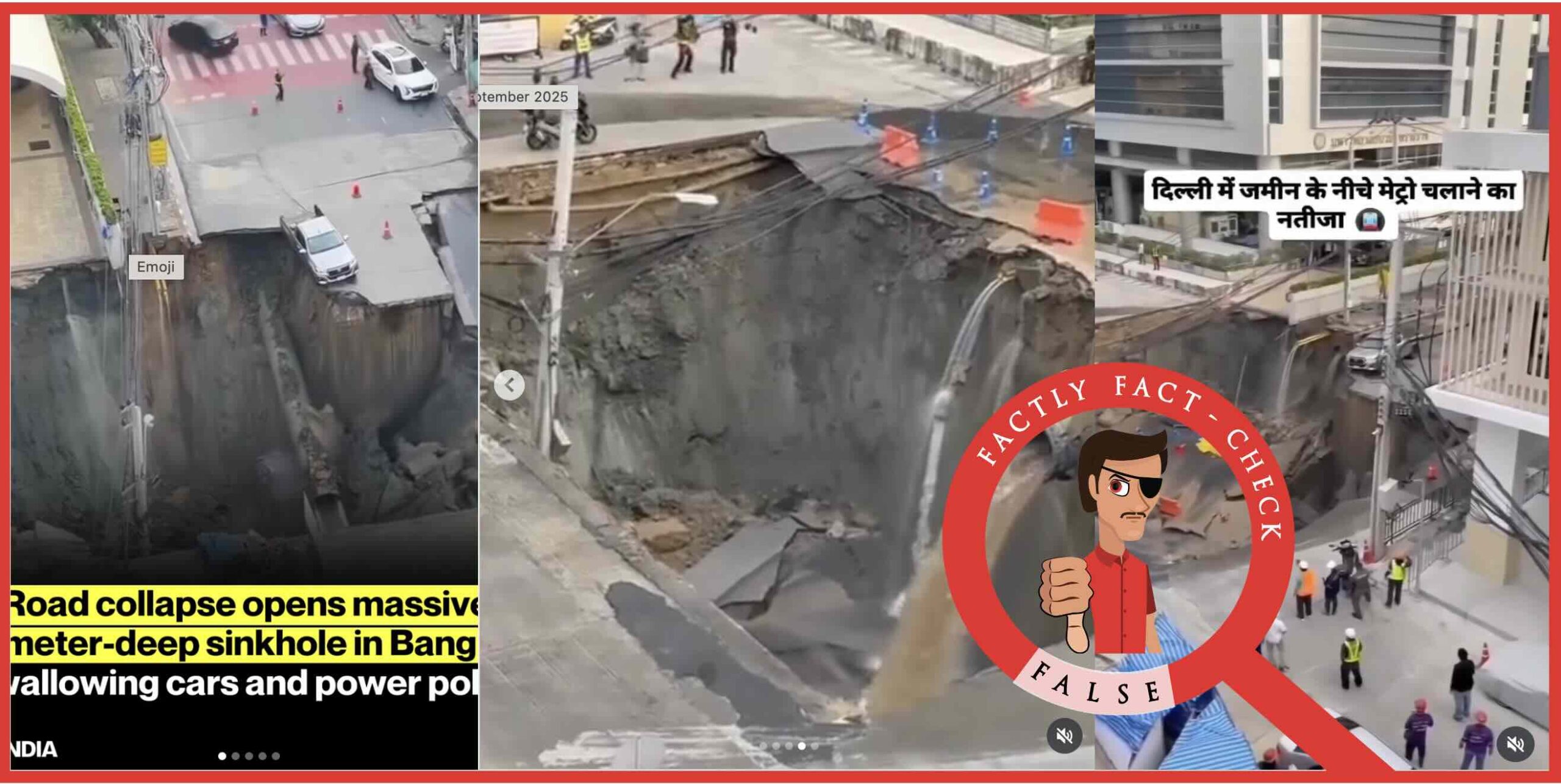 Fact: The viral video actually depicts the sinkhole incident in front of Vajira Hospital in Bangkok on 24 September 2025. While Delhi has experienced metro construction collapses near Masoodpur Flyover in August 2015 and at Maidangarhi in May 2023, the viral video is not related to any of these Delhi incidents. Hence the claim FALSE.
