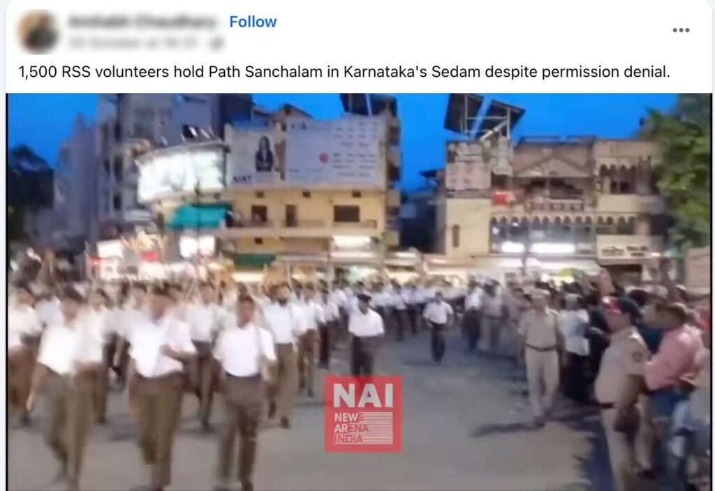 A video (here, here, here, and here) showing RSS members marching with sticks is being widely shared on social media platforms, claiming that it depicts a recent RSS march (Path Sanchalan) held in Sedam, Karnataka, which took place despite police denying permission. The post reads: “1,500 RSS volunteers hold Path Sanchalan in Karnataka’s Sedam despite permission denial.” In this article, we fact-check the claim made in the post.