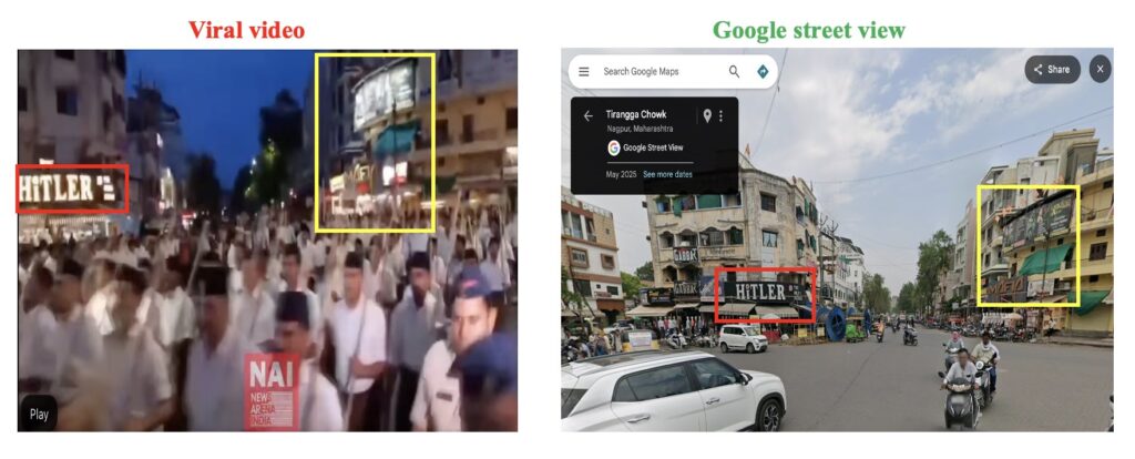 Upon carefully reviewing the viral video, we noticed the insignia on the shoulders of policemen resemble those of Maharashtra Police. We also observed shop names in the background, including ‘Mafia’ and ‘Hitler’. Using these clues, we geolocated the location seen in the viral video on Google Maps. The location shown in the viral videos is Tiranga Chowk, Nagpur, Maharashtra. A comparison between the viral video and the location on Google Maps is shown below.