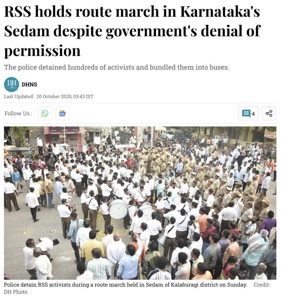 Additionally, according to news reports, the RSS held a march (Path Sanchalan) in Sedam, Kalaburagi district, Karnataka, on 19 October 2025, despite the government denying permission and imposing police restrictions. When RSS members began the rally without the necessary permits, the local police in Kalaburagi detained the participants, releasing them later the same day (here, here).