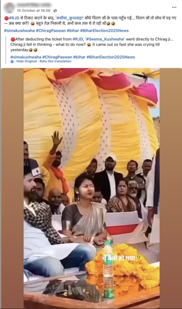 Bihar elections are approaching, campaigns are heating up, and political parties are preparing to finalise and announce their candidates (here and here). Amid this, a video (here, here and here) has gone viral on social media showing RJD leader Seema Kushwaha sharing the stage with LJP leader and union minister Chirag Paswan. It is being claimed that she rejected a seat in the RJD and is now seeking support from Chirag Paswan for a ticket. Let’s find out the truth behind this video.
