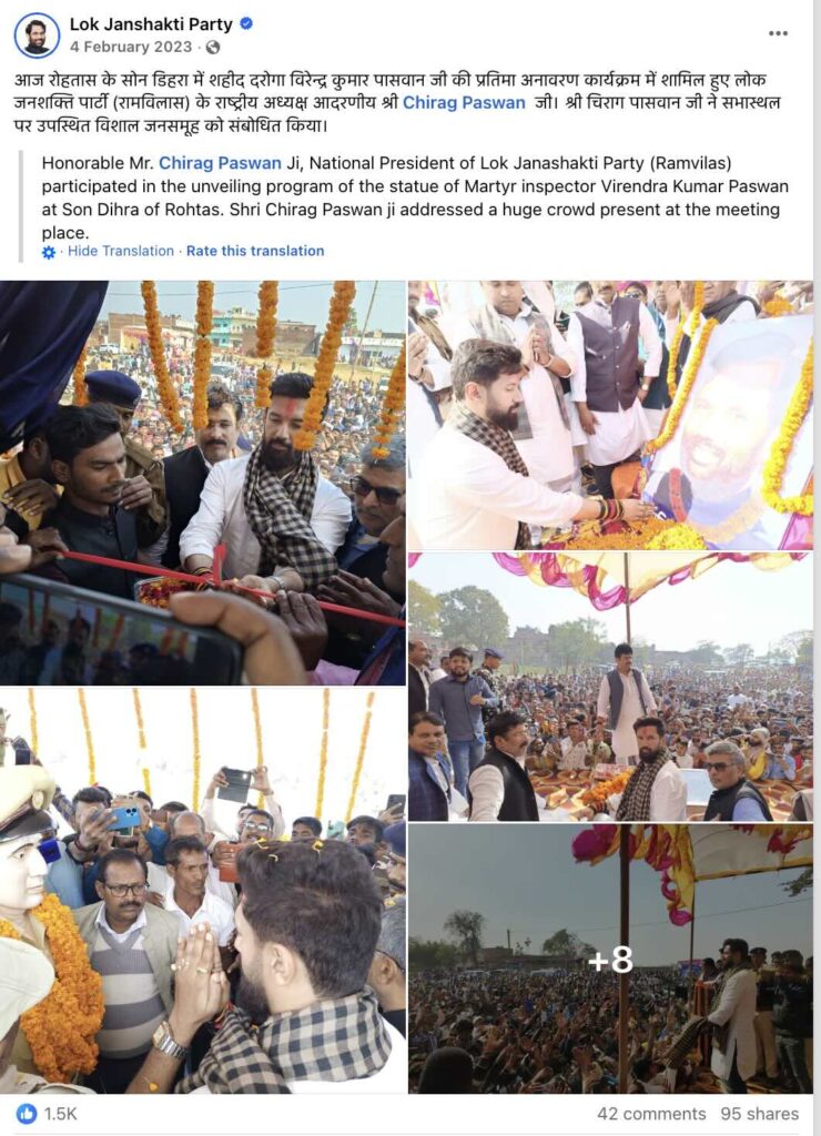 A keyword search with a date filter further led us to photographs of the same event posted on the official Facebook page of the Lok Janshakti Party on 04 February 2023. In these images, Chirag Paswan and Seema Kushwaha are wearing the same outfits as in the viral video, and the same person in a blue kurta can be seen sitting beside them. This confirms that the viral video and the event are from the same occasion. According to the Facebook post, the event was the unveiling ceremony of the statue of Martyr Inspector Virendra Kumar Paswan at Son Dihra, Rohtas, where Chirag Paswan, National President of the Lok Janshakti Party (Ramvilas), addressed a large gathering.