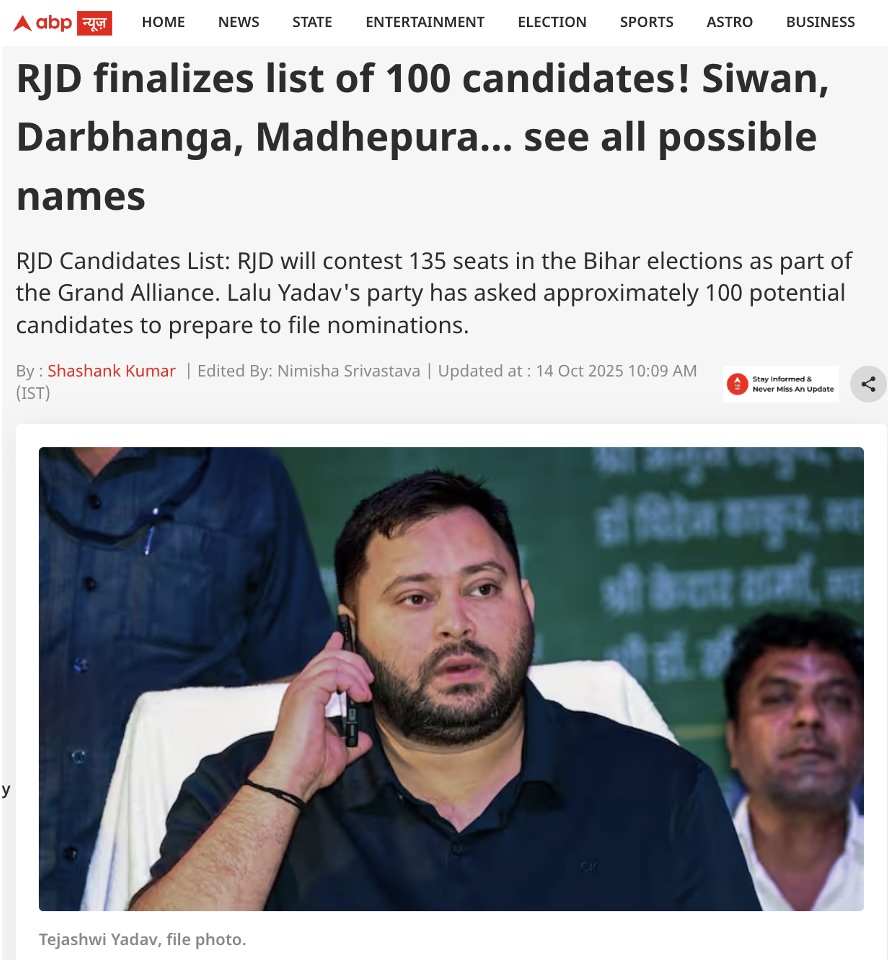 Additionally, as of today (October 15), RJD has not officially announced its candidates for the Bihar elections. Although possible candidate lists are circulating online, nothing has been confirmed.