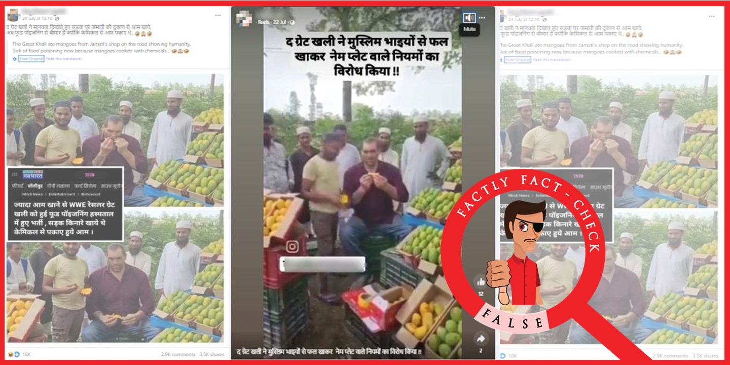 The Uttar Pradesh government recently issued an order for shop owners & vendors along the Kanwar Yatra route to display their names, which has sparked controversy (here, here). In this context, a video of renowned wrestler ‘The Great Khali’ eating mangoes from a Muslim vendor’s cart is being widely shared across social media, claiming that Khali is protesting against the Uttar Pradesh government’s decision by eating mangoes at a Muslim vendor’s shop (here, here, & here). Sharing the same visuals of Khali eating mangoes, some posts claim that Khali got sick due to food poisoning from eating roadside mangoes that had a lot of pesticides and chemicals (here, here, & here). Through this article, let’s fact-check the claims made in these posts.